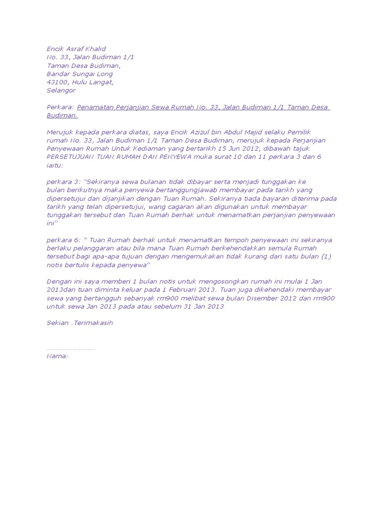 Pasal 1 masa berlakunya perjanjian sewa ayat 1 sewa menyewa ini berlaku untuk jangka waktu1 (satu) bulan, terhitung sejak tanggal 15 juni 2017 dan berakhir pada tanggal 14 juli 2017. Dimulai dari surat perjanjian sewa, surat perjanjian jual beli, surat kesepakatan, surat kerja sama berikut beberapa contoh surat perjanjian sewa yang bisa dipelajari dan dijadikan referensi dalam surat ini ditandatangai pada (tulis tanggal, bulan, dan tahun surat ditandatangani) dan akan berlaku. Ada juga yang menceroboh rumah yang disewakan, atas alasan mahu 'mengusir' penyewa setelah gagal berbincang. Pelunasan tunggakan rekening listrik, rekening pdam, dan rekening telepon selama 6 bulan merupakan tanggung jawab pihak pertama Surat perjanjian sewa mobil bulanan.docx. Anda sedang membuka postingan contoh surat perjanjian sewa mobil yang berada pada kategori contoh surat dengan tag postingan berikut contoh surat. Sewanify menghasilkan surat perjanjian sewa rumah yang sangat mudah untuk difahami oleh. Surat perjanjian penting digunakan sebagai bukti adanya perjanjian dengan orang lain. Perjanjian sewa rumah adalah satu akad kontrak yang boleh dilakukan antara (anda) tuan rumah dan penyewa anda (si penyewa), jadi segalan peraturan, syarat, atau apa jua tanggugungjawab dan klausa yang ada dalam surat perjanjian sewa rumah tersebut perlu dipatuhi oleh penyewa. Padahal jika suatu hari terjadi satu kasus, surat ini akan sangat membantu memecahkan permasalahannya. .sewa beli rumah surat perjanjian kredit pemilikan rumah antara bank dan nomer: Surat perjanjian kontrak rumah bulanan. Kami yang bertanda tangan di bawah ini 9.